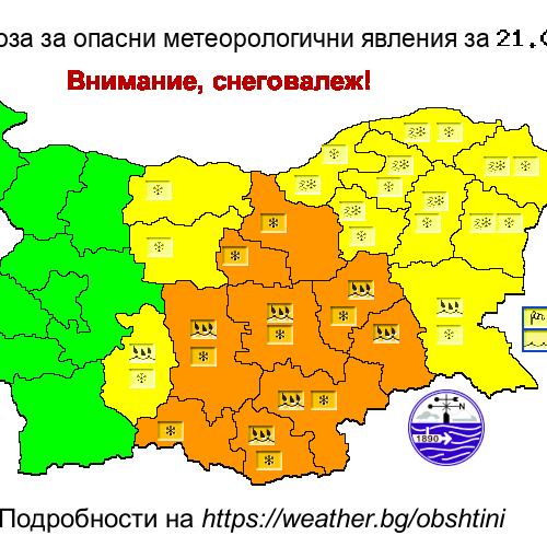 Оранжев код за опасно време е в сила в 9 области за 21 февруари. Очакват се значителни валежи от дъжд с количества 35-65 mm, а по високите те ще бъдат от сняг. Това са Пловдив, Смолян, Кърджали, Хасково, Ямбол, Сливен, Стара Загора, Габрово и Велико Търново. „През следващото денонощие времето ще е облачно, на много…