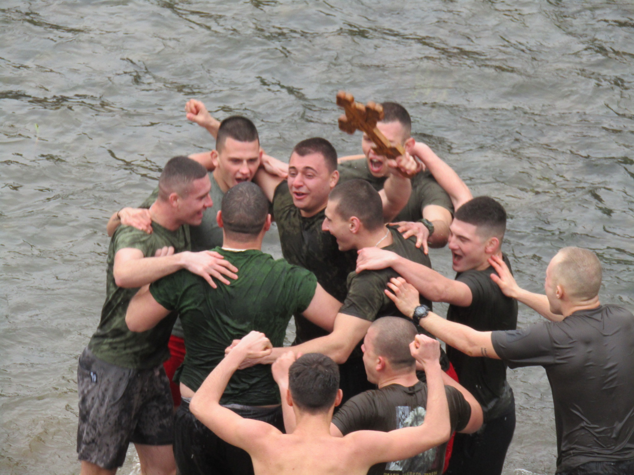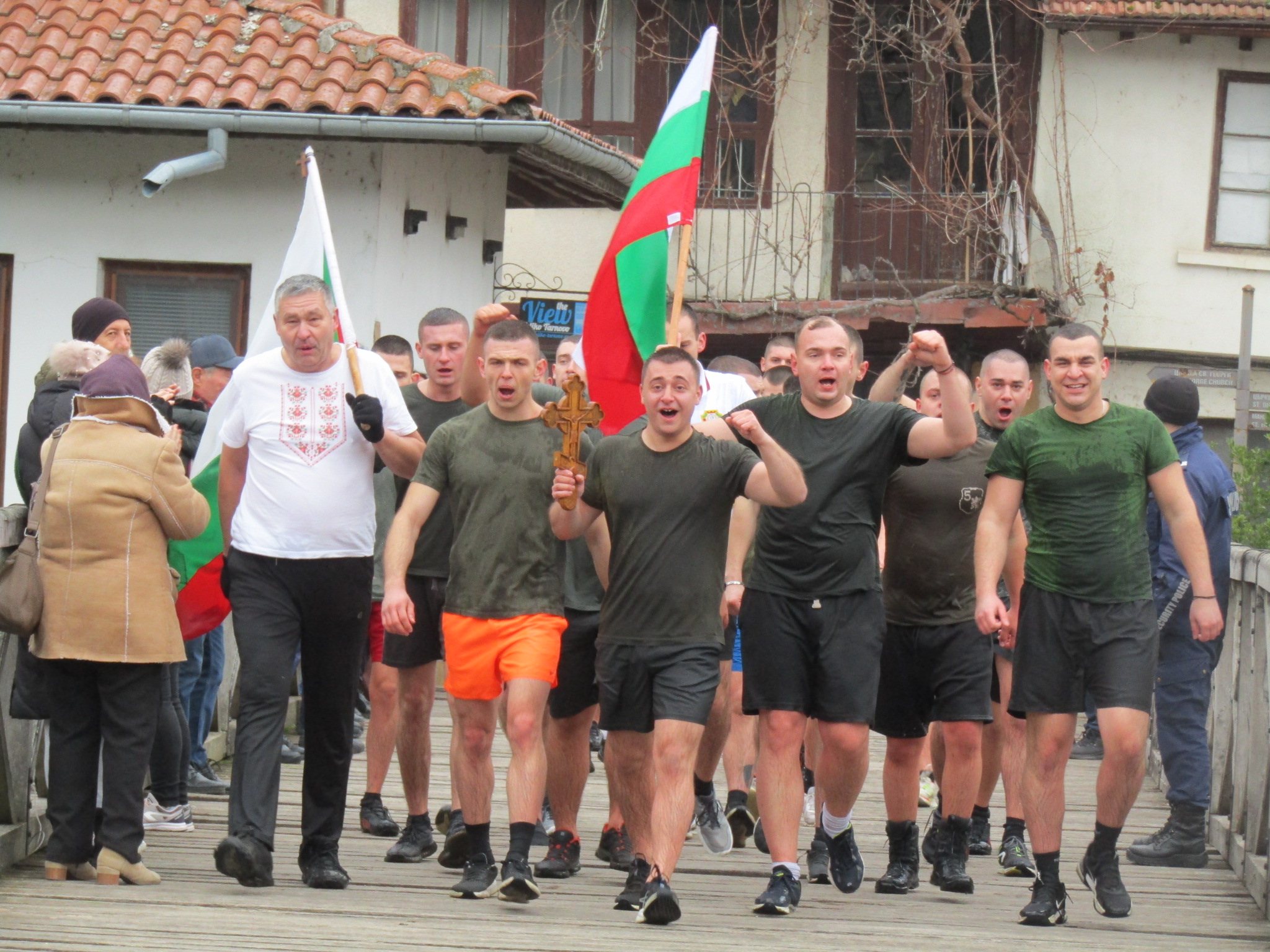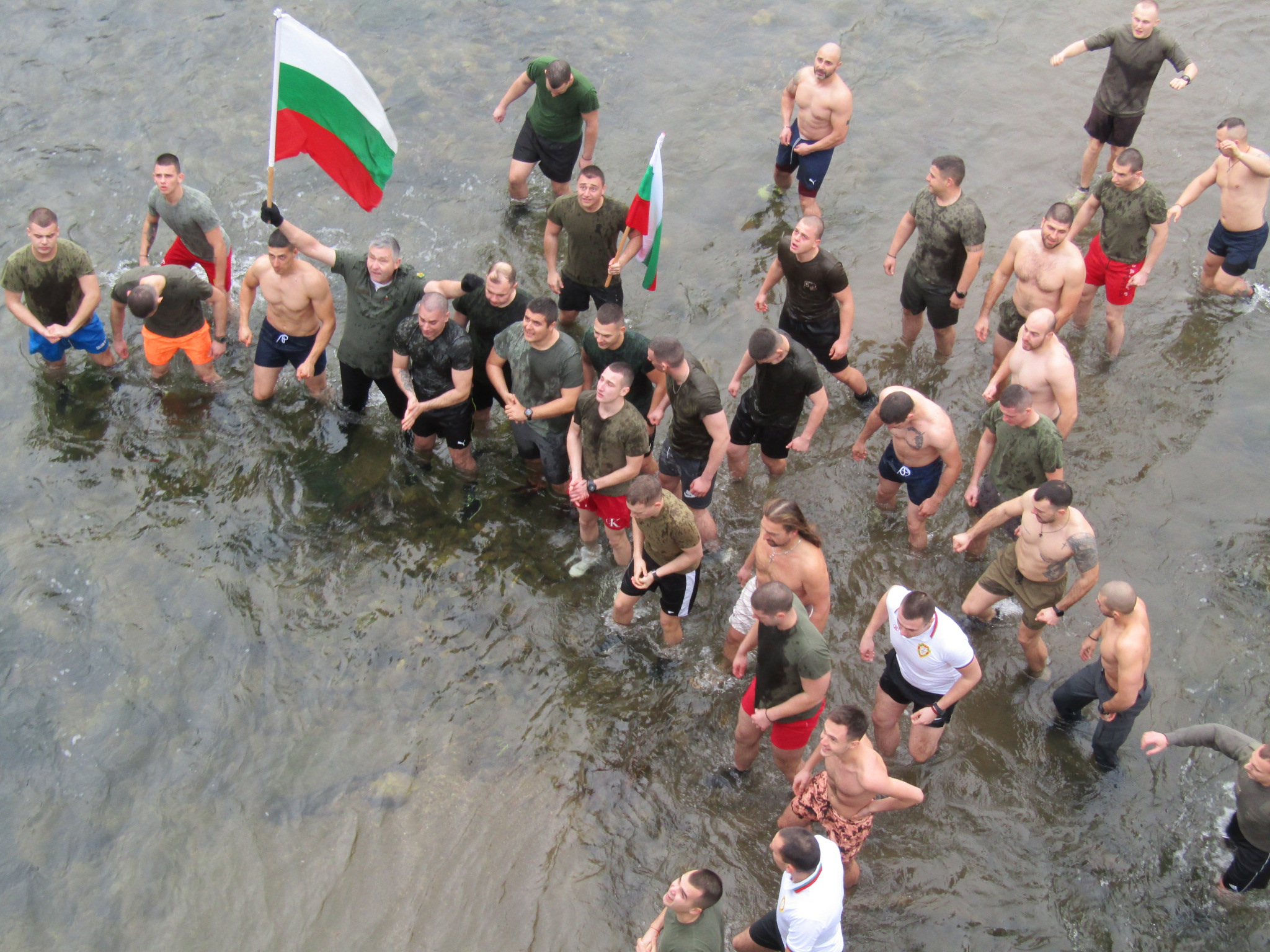 В ледените води на река Янтра се хвърлиха над 40 души, като 25 от тях бяха курсанти. През цялото време те скандираха „Българи юнаци“.